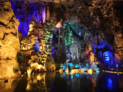 滑行而下伙伴們即開始游覽幽美奇絕的溶洞,在洞內(nèi)互相攙扶攀登193級超高臺階后,大家順利走出溶洞,下山前往天鵝湖。